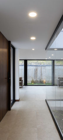 La propuesta parte de aceptar el terreno como es, sin someterlo. En la zona más comprometida, se extiende un gran volado de hormigón armado que flota sobre el vacío y alberga el garaje, y una pasillo de circulación secundaria que no lleva hacia la lavandería, asador, cocina y patio posterior. En el otro extremo, junto al muro, se despliega un jardín lineal que baña de luz natural a la sala y al comedor. Esta relación entre lleno y vacío, entre masa y luz, define el carácter formal de la vivienda.
